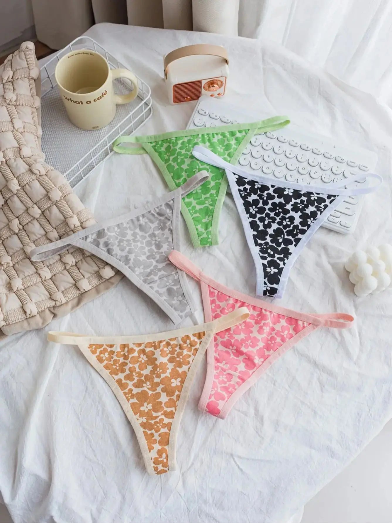 Mixed Color Floral Patchwork Thin Strap Comfortable Women's Thong Cotton Underwear Girls' Briefs 5-Pack