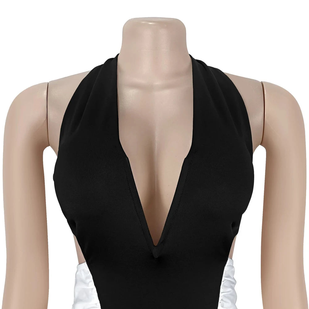 Luxury Women Ruched Dresses Two Tone Contrast Open Back Maxi Halter Midinight Robes Evening Sexy Party Long Dress