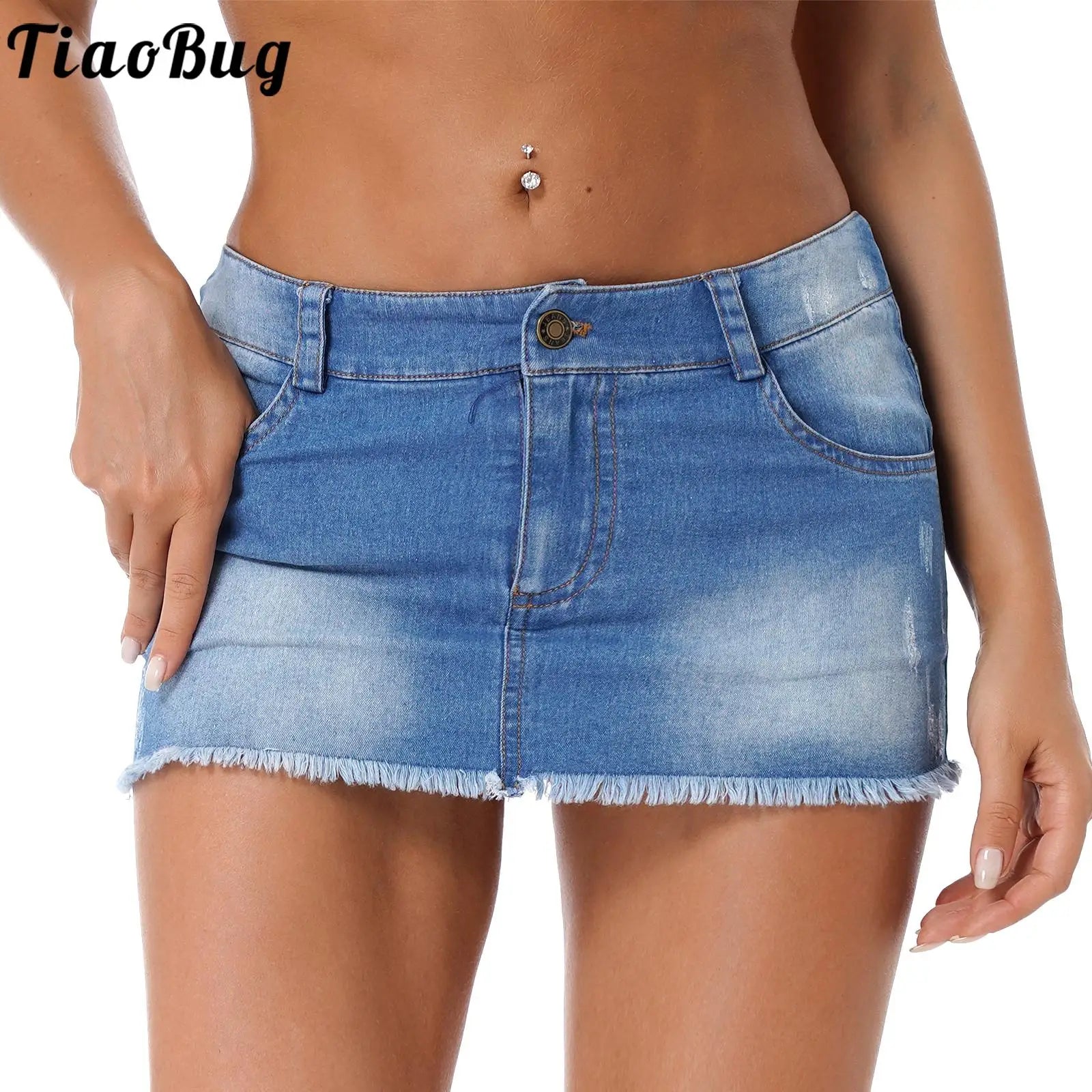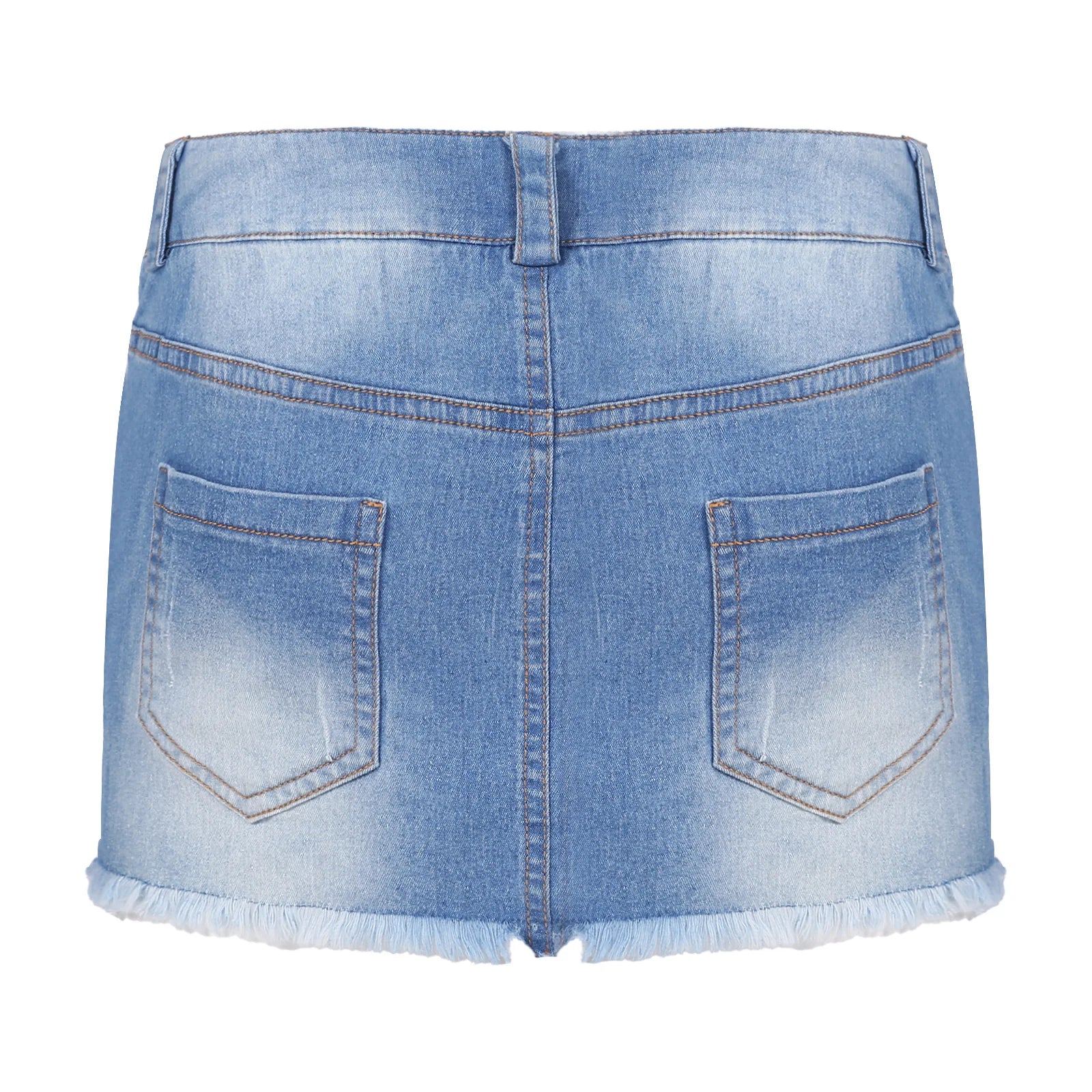 Women Summer Sexy Denim Skirt Fashion Frayed Hem Short Skirts Casual Mid Waisted Pockets Slim Fit Clubwear Solid Color Skirts